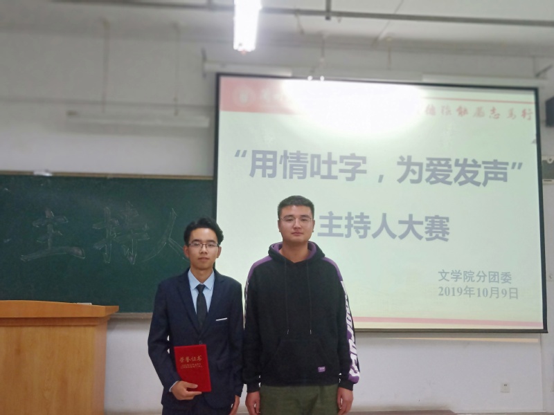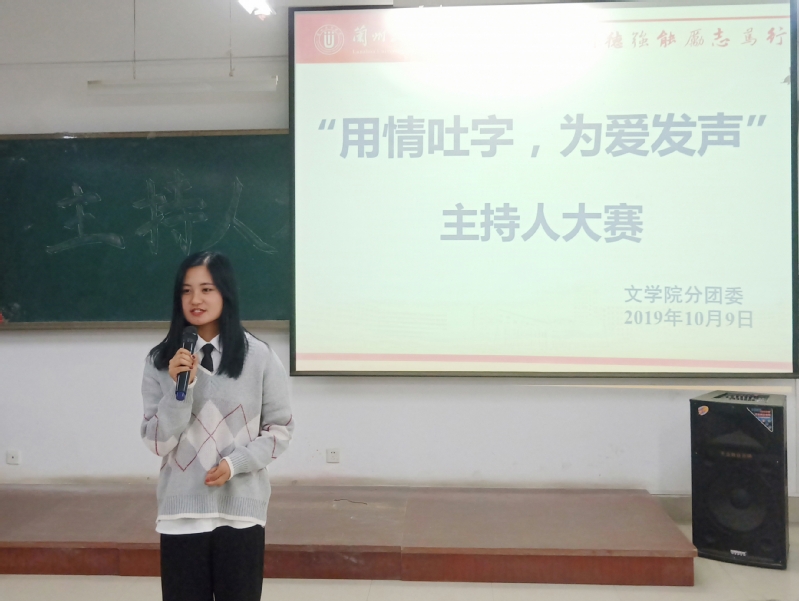 笑言芳华,口谈文雅。我校文学院于10月9日晚在3-504教室隆重举办2019级新生主持人大赛。文学院学生会主席张旭,副主席文佳,分团委书记陈文霞,17级优秀主持人王毅以及学生会干部路雨龙担任此次大赛评委。参赛人员包括19级汉语言文学专业一班、二班、三班,戏剧影视文学班,文化市场经营与管理班以及文秘班等同学。