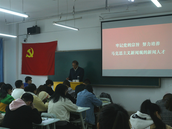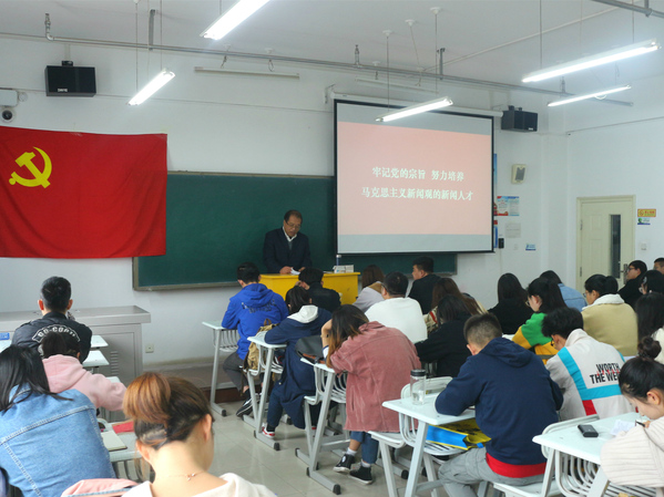 课上,党总支书记王金寿围绕马克思主义新闻观、新时代习近平总书记对新闻工作者的要求以及新闻传播学院对新闻学子的期望,广大学生党员要以“党建统领,对标争先,立德树人,特色发展”为总目标,牢固树立马克思主义新闻观,坚持宣传党的方针政策,牢记习近平总书记的教导,做党的政策主张的传播者,时代风云的记录者,社会进步的推动者,公平正义的守望者。