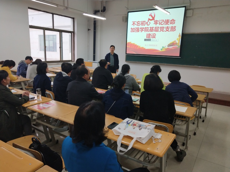 10月23日下午在3-804,化工学院党总书记张兴辉为全体教工党员、学生党员讲党课。根据“不忘初心、牢记使命”主题教育前期调研结果,针对“不忘初心、牢记使命”加强学院基层党支部建设开展。