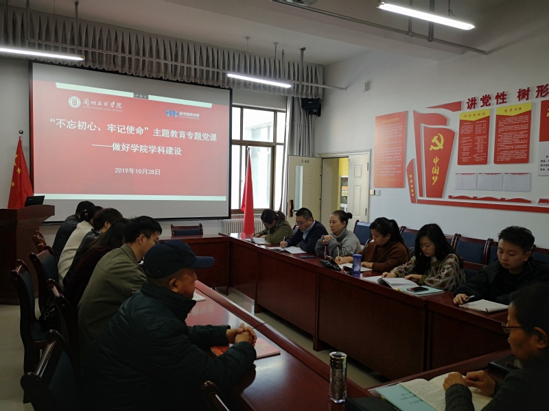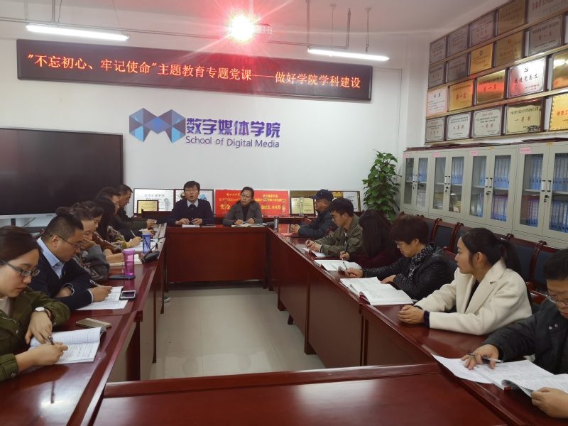 10月28日下午,数字媒体学院院长李恒杰于2-415召开了“不忘初心、牢记使命”主题教育党课,由学院党总支书记陈小琴主持,参会人员有全体教工党员、各专业主任以及各部门负责人等。