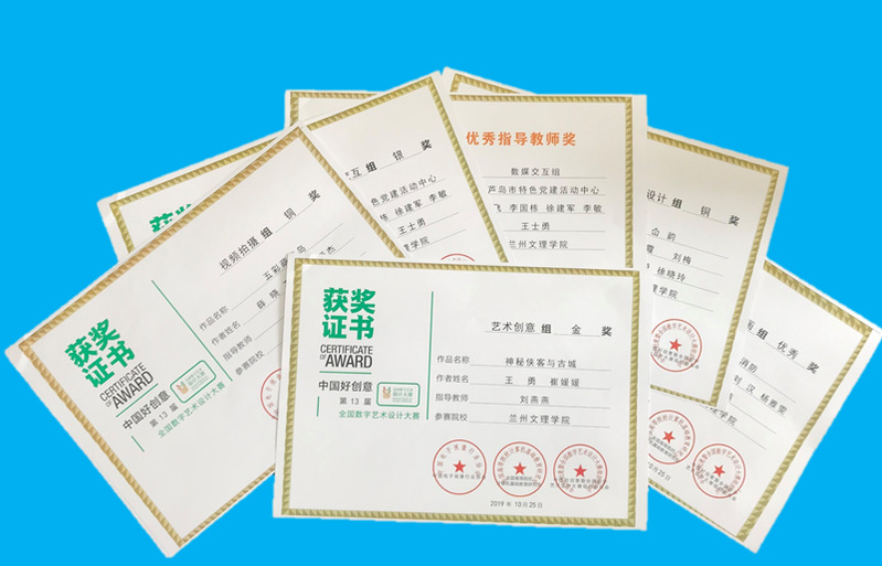 我校学生作品共获得金奖一项、银奖一项、铜奖两项、优秀奖一项;一名指导教师获得优秀指导教师奖。数字媒体学院学生在本次大赛主题类比赛中共获“3.5万”元现金奖金。分别是数媒学院刘燕燕老师指导王勇、崔媛媛2名同学创作的作品《神秘侠客与古城》获得艺术创意组金奖;黄珍、王士勇老师指导侯云飞、李国栋、徐建军、李敏4名同学创作的作品《葫芦岛市特色党建活动中心》获得数媒交互组银奖;刘燕燕老师指导薛晓、石怡、马潇杰3名同学创作的作品《五彩葫芦岛》获视频拍摄组铜奖;王士勇、徐晓玲老师指导杨娇霞、刘梅2名同学创作的作品《仚 韵》获得产品设计组铜奖;刘燕燕老师指导的张绍惠、刘芳、刘汉、杨雅雯创作的作品《仚仚消防》获得数字动画组优秀奖;学院指导教师王士勇获得“优秀指导教师奖”。