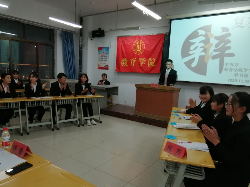 2019年11月5日晚,教育学院学生会学习部于在1-504举行了复赛第一、二场。比赛特邀校级优秀辩手胡馨元、王海伦担任评委。