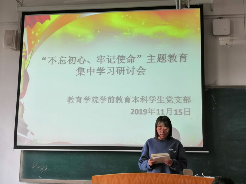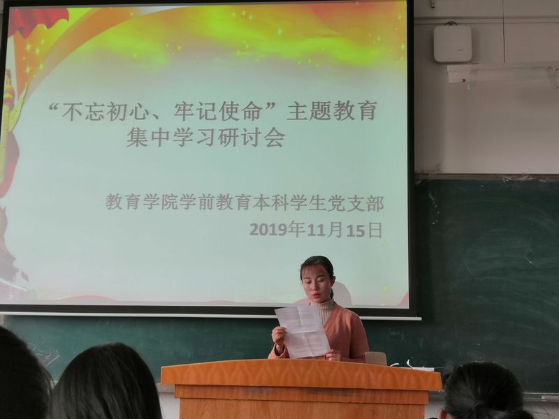按照《中共兰州文理学院委员会关于“不忘初心,牢记使命”主题教育持续开展集中学习研讨的补充通知》安排,教育学院学前教育本科学生党支部于2019年11月15日中午在3-203开展“不忘初心,牢记使命”主题教育集中学习研讨会。大会由教育学院学前教育本科学生党支部书记王颖主持。