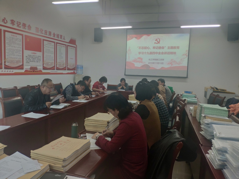 10月28日至31日,中共十九届四中全会在北京举行。11月13日中午,化工学院教工党支部在学院会议室召开会议,学习领会十九届四中全会精神,副院长杨光主持了此次会议,全体教工党员参与。