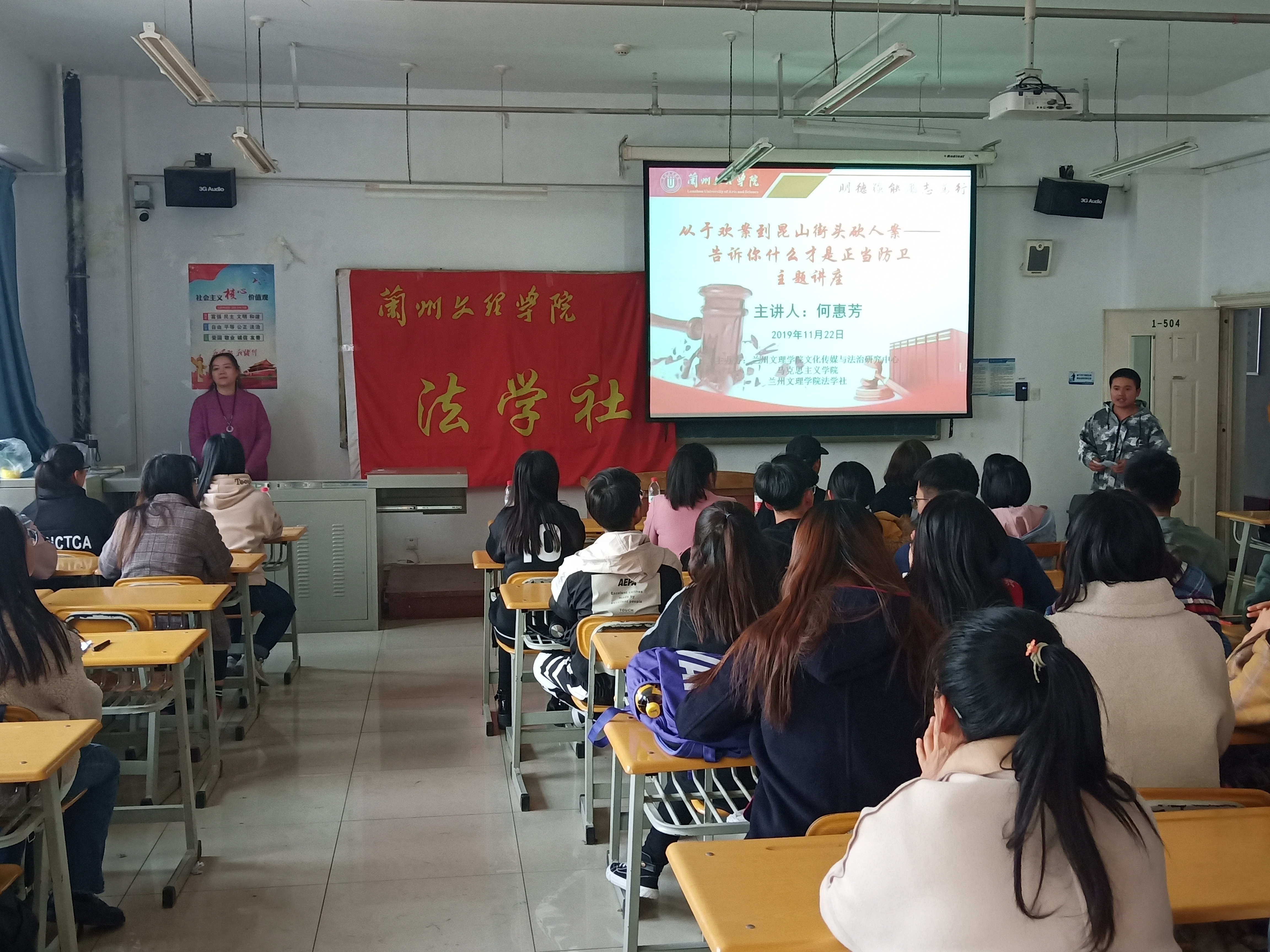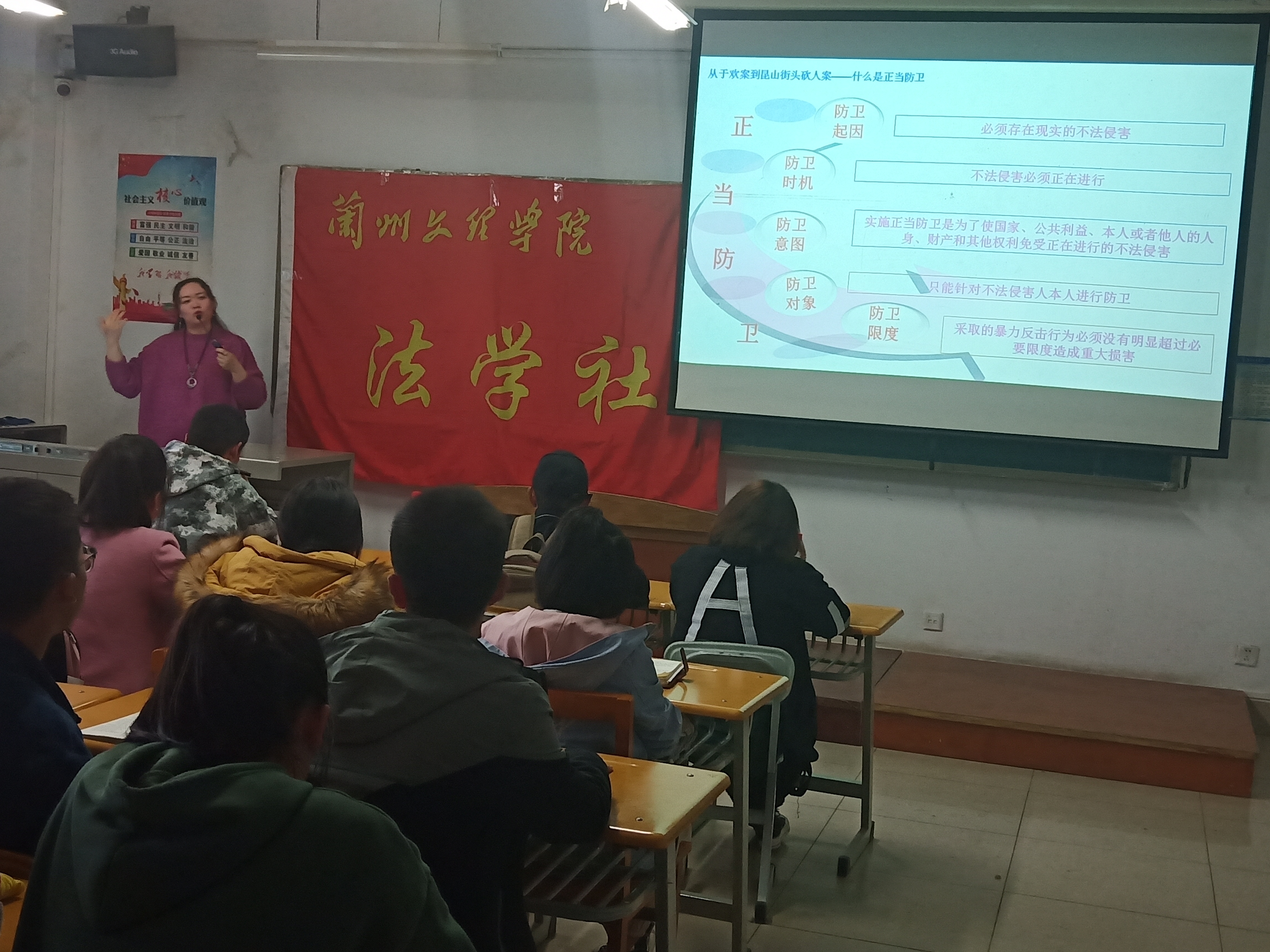 2019年11月22日星期五下午四点半,马克思主义学院的何惠芳老师在南校区1-504教室开始普法系列专题讲座第二讲:《从于欢案到昆山街头砍人案——告诉你什么才是正当防卫》。