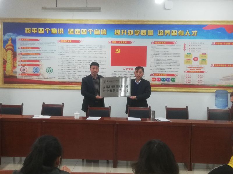 2019年10月23日,“全国高校教师教育课程对分教研示范基地”在兰州文理学院教育学院签约揭牌。“对分课堂”创始人、复旦大学东方学者张学新教授,兰州文理学院教育学院院长董小平,国培办主任豆宏健,部分教师及学生代表参加了活动,签约揭牌仪式由豆宏健主任主持。“全国高校教师教育课程对分教研示范基地”的揭牌是对兰州文理学院教育学院近年来对分课堂教学模式实践和探索的肯定,也是对教师教育教学模式进一步深化改革、整合资源、不断创新的鞭策。 仪式上,教育学院聘请张学新教授为“全国高校教师教育课程对分教研示范基地”指导专家。