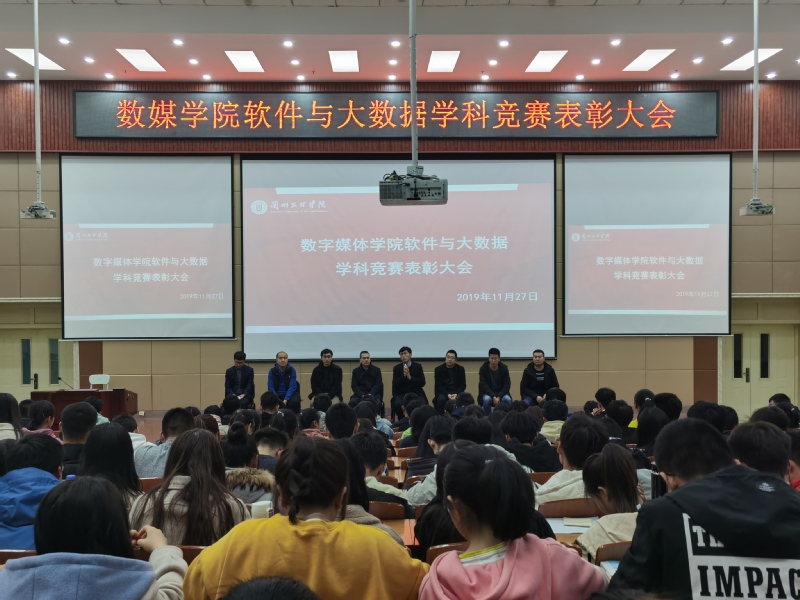 为进一步总结经验,表彰先进,树立典型,更好的让同学们在专业学习中取得更好的成绩。数字媒体学院于2019年11月27日晚召开“2019年度软件与大数据专业群学科竞赛表彰大会”。教务处副处长胡建军教授、数字媒体学院院长李恒杰教授、校企合作办主任蔺国梁副教授、创业就业办主任姚林、主管竞赛工作教师刘瑒、专业和群教师代表、学生会全体成员及软件工程与大数据科学与技术全体学生近350人参加了此次表彰大会,会议由数据科学与大数据技术专业骨干教师赵世林主持。