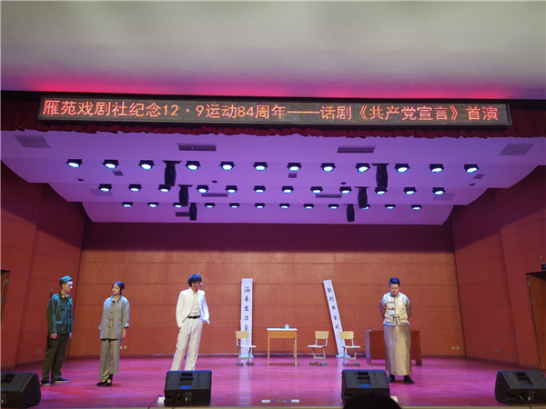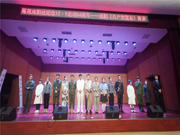 为纪念一二•九学生抗日救国运动84周年,激发青年学生的爱国情怀,12月9日晚上, 雁苑戏剧社纪念12·9运动84周年-话剧《共产党宣言》在大学生活动中心音乐厅首演。校团委副书记安婧、刘嘉璐老师与学生代表共同观看了演出。