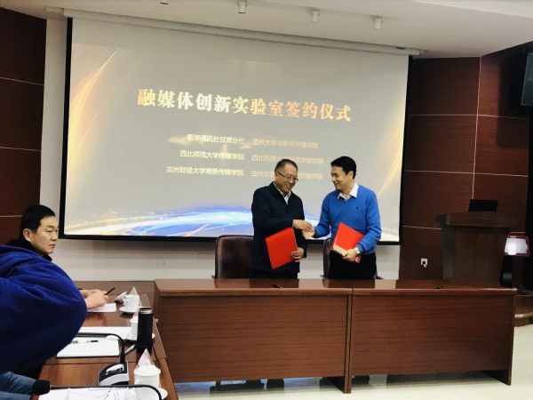 12月18日下午,新华社甘肃分社与省内高校新闻传播院系签订战略合作协议,我校新闻传播学院作为五个创始成员单位与新华社甘肃分社签订了融媒体创新实验合作协议,共建融媒体创新实验室。新华社甘肃分社社长、党组书记任卫东,副社长马维坤,副社长谭飞及社属各有关部门负责人和来自兰州大学、西北师范大学、西北民族大学、兰州财经大学、兰州文理学院的新闻传播院系负责人参加签约仪式。签约仪式结束后,与会人员进行了座谈交流。