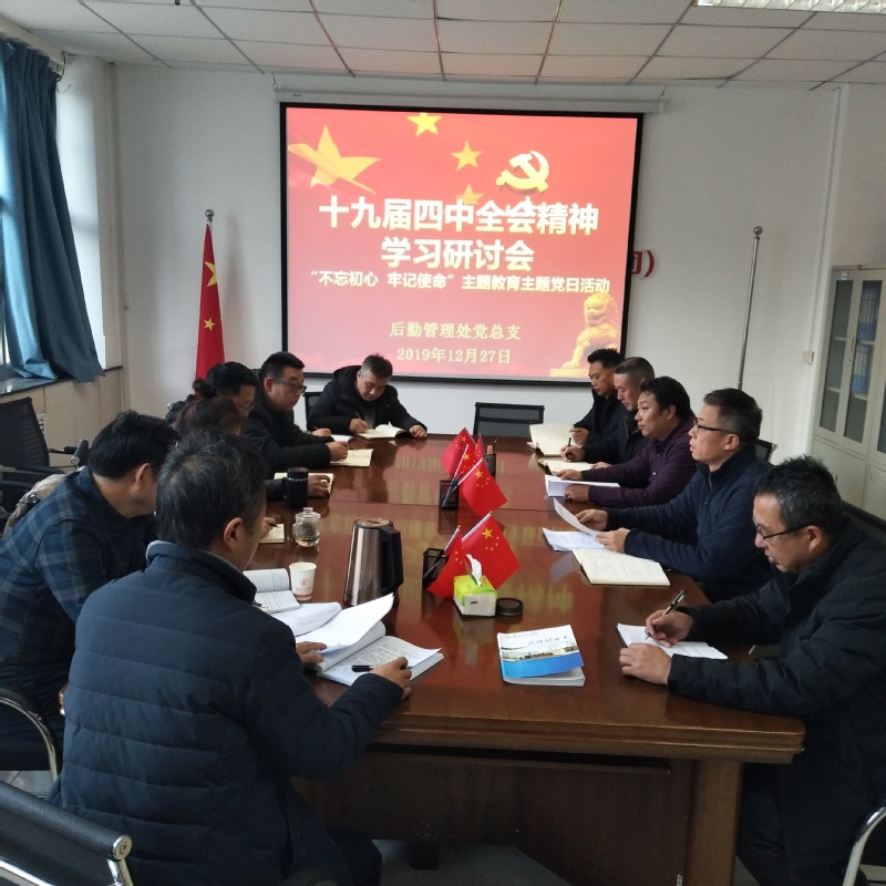 为深入开展“不忘初心、牢记使命”主题教育,根据学校主题教育领导小组办公室《关于在“不忘初心、牢记使命”主题教育中认真学习贯彻党的十九届四中全会精神的通知》精神,在认真安排好党支部的开展学习,组织全体党员参加党的十九届四中全会精神宣讲会学习的基础上,后勤处党总支召开党的十九届四中全会精神专题学习研讨会。