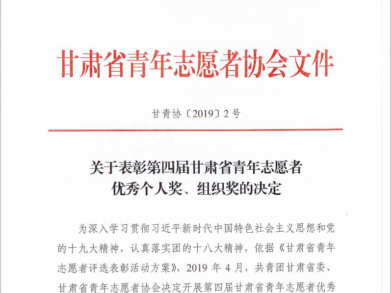 为深入学习贯彻习近平新时代中国特色社会主义思想和党的十九大精神,认真落实团的十八大精神,履行好共青团引领青年、组织青年、服务青年的职责和使命,大力弘扬“奉献、友爱、互助、进步”的志愿精神,引导广大团员青年培育和践行社会主义核心价值观,根据《甘肃省青年志愿者评选表彰活动方案》,2019年4月,共青团甘肃省委、甘肃省青年志愿者协会组织开展四届甘肃省青年志愿者优秀个人奖、组织奖评选表彰活动。