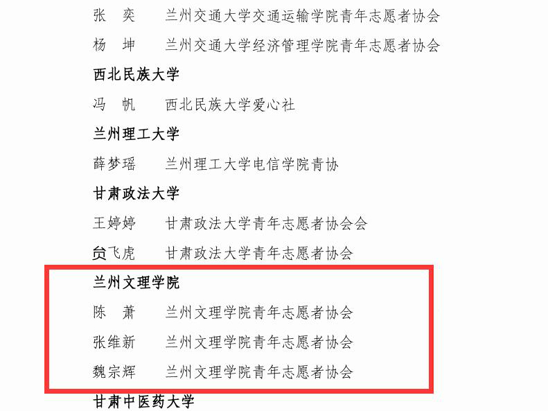 近日,甘肃省青年志愿者协会印发了《关于表彰第四届甘肃省青年志愿者优秀个人奖、组织奖的决定》,我校新闻传播学院陈萧、传媒工程学院魏宗辉、教育学院张维新被授予第四届甘肃省青年志愿者优秀个人奖。此次3名青年志愿者受到省青年志愿者协会表彰,是我校青年志愿服务领域的又一硕果。