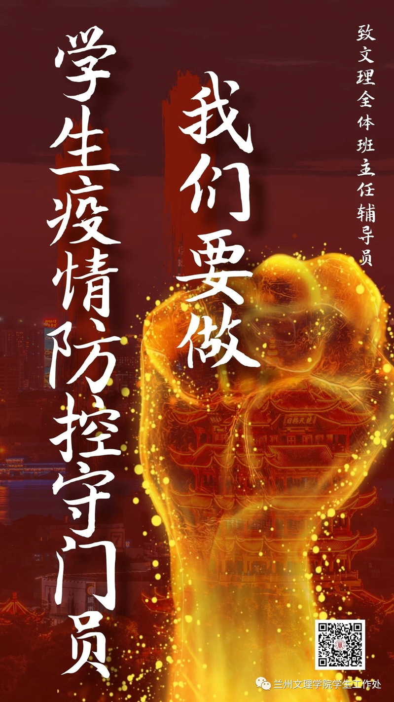 自新型冠状病毒感染的肺炎疫情发生以来,学校党委高度重视和关注疫情发展态势,深入学习贯彻习近平总书记关于疫情防控的重要讲话和指示精神,按省委、省教育厅的相关工作要求,第一时间启动学校公共卫生突发应急预案,成立疫情联防联控领导小组,进行疫情防控的工作部署,排查消除隐患,严格防控措施。习近平总书记指出“疫情防控是当前最重要的工作”。非常时期,全国战“疫”。我们作为学生工作者,虽不在抗击疫情的医疗一线,却能通过做好战“疫”期间学生的思想引领、信息统计、心理疏导、宣传教育、学业指导等,稳稳地站在保障学生身心安全的第一线!为坚决打赢疫情防控这场没有硝烟的战役,在此,我们向全体班主任、辅导员发出:并肩战“疫”,疫情不除不松气,要做学生疫情防控守门员的号召!让我们众志成城,团结一心,奋勇向前,共同打赢这场特殊战“疫”!