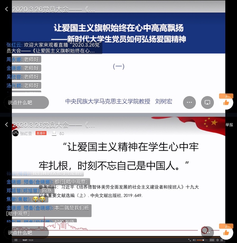 2020年3月26日下午,教育学院学前教育本科学生党支部,通过钉钉群直播的方式开展线上支部大会。主要学习了由刘树宏老师主讲的:《让爱国主义旗帜始终在心中高高飘扬——新时代大学生党员如何弘扬爱国精神观》,支部全体党员参加了本次学习。