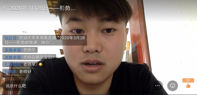 据学校2020年“形式与政策课”统一安排和部署,教育学院党总支的具体安排,3月28日上午,教育学院各班班主任利用网络授课形式,在线直播学习“习近平总书记2月23日在统筹推进新冠肺炎疫情防控和经济社会发展工作部署会议上的讲话”精神。各班同学在网上认真学习,积极讨论,网络授课效果良好。