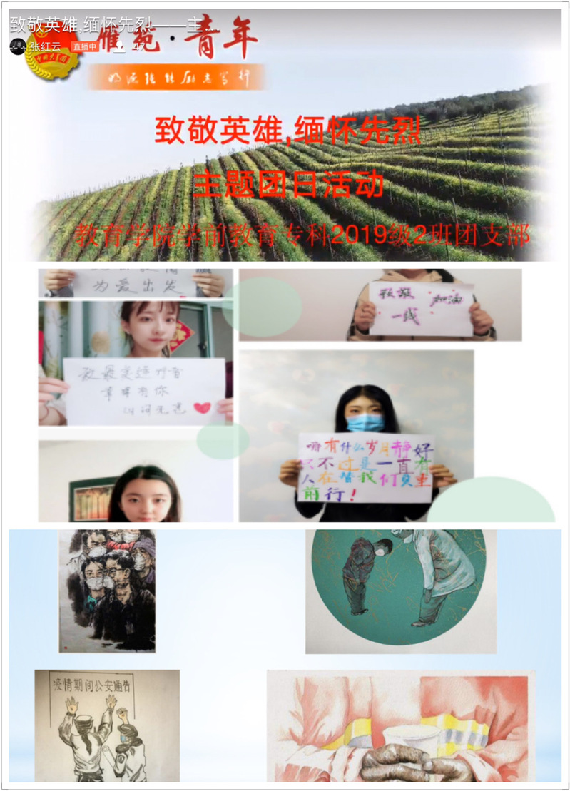 2020年3月31日,在清明节来临之际,遵照校团委指示,教育学院分团委组织各班团支部开展以“致敬战疫英雄”为主题的线上主题团日活动。各班团支部围绕主题积极组织开展线上活动,主要有群直播、设计海报、绘画、制作小视频、手工作品等,大家结合各自的专业特色,以不同的方式向“战役英雄”致敬。