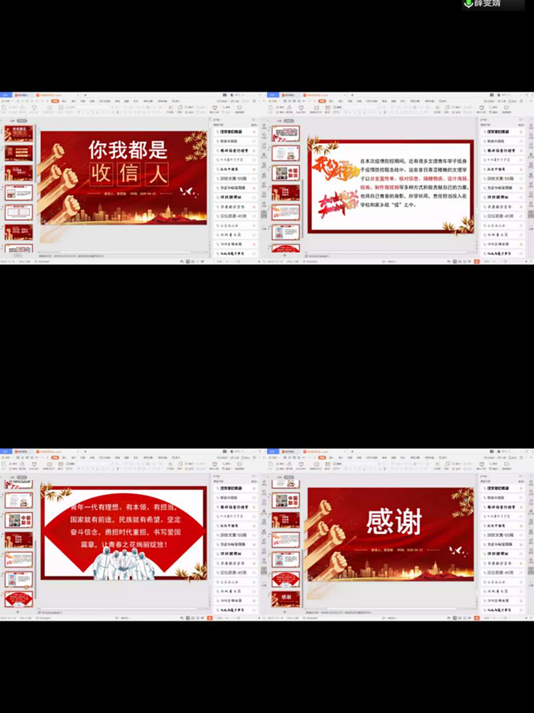 赵伟伟同学对学习习近平总书记给北京大学援鄂医疗队90后党员回信的内容用PPT展示,我们每一个人都是收信人,抗击疫情不是一个人的努力,而是一群人的战斗。面对这场特殊的考验,新时代的中国青年应用他们的智慧与担当,为打赢抗击疫情阻击战贡献蓬勃向上的青春力量。刘宏博同学对回信精神做了简要说明,新时代的中国青年是好样的,在这场人民战“疫”中,广大青年用实际行动充分证明了他们是有远大理想,胸怀家国的的一代,广大青年应不畏风雨,在党和人民最需要的地方绽放青春光芒。薛雯婧同学提倡当代青年践行回信精神,当代青年应苦练本领,勇担时代重担,书写爱国篇章。