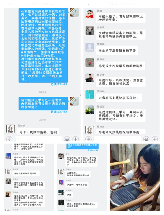 各班主题团日活动都积极围绕着线上教学的优点、不足、以及如何把握好线上教学并提高学习效率展开了积极的讨论,同学们都能积极参与到其中,分享学习成果和学习心得。依据自媒体平台,让我们在疫情期间做好到了“停课不停学”。线上教学的最大优势就是打破了时间和空间上的限制,师生不用出门就可以完成教与学的任务,而且课后还可以看直播回放,弥补了没有及时听课或者当时听不明白的遗憾。但是,有同学表示:学习质量没有线下好,感觉没有在校学习的氛围,网速不好,有时候听不清楚,学习没有紧迫感,在家学习容易分心,老师讲的跟做笔记的速度永远是两个概念等等一系列问题。