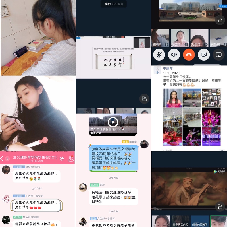 七十年栉风沐雨流岚岁月,七十年立德树人春华秋实。庆母校七十华诞,创文理美好未来。2020年5月14日,兰州文理学院迎来建校70周年庆典,教育学院分团委组织开展线上庆祝活动,共同回顾我校70年光辉历程,庆祝兰州文理学院七十华诞,本次活动由学生会主席田文攀主持,学生会全体干事参加。