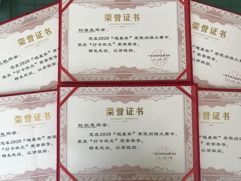 疫情期间,图书馆积极宣传和组织学校师生读者参加。我校王敏、张静莹、景改丽、兰莹丽、李金霞、张转花、刘海亮,赵淑慧等8名同学获得“打卡状元”称号。