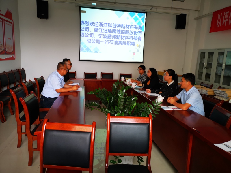2020年6月16日,宁波市象山县重点企业招聘宣讲会在化工学院举行,本次招聘的重点企业为宁波勤邦新材料科技有限公司、浙江科普特新材料有限公司、浙江钰烯腐蚀控制股份有限公司。