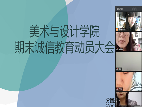 期末考试在即,为了提高同学们对期末诚信考试的重视程度,7月3号中午,美术与设计学院通过腾讯会议平台,举办了期末诚信教育动员大会。会议由团学办主任唐艳丽老师主持,辅导员郭子弘、李晶晶及全体学生会干部参加。