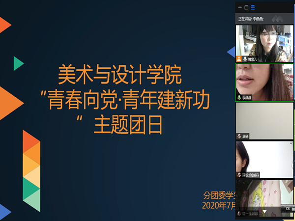 为庆祝中国共产党成立99周年,激励广大青年学生坚定理想信念,树牢爱党情怀,7月6日中午美术与设计学院分团委依托腾讯会议平台召开线上“青春心向党,青年建新功”主题团日活动。活动由团学办主任唐艳丽老师主持,辅导员郭子弘、李晶晶及全院学生干部参加。