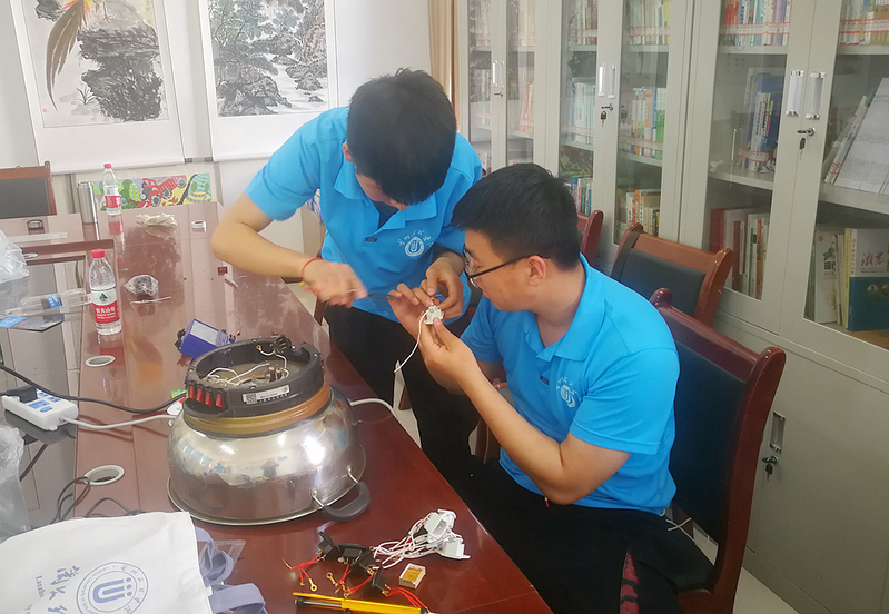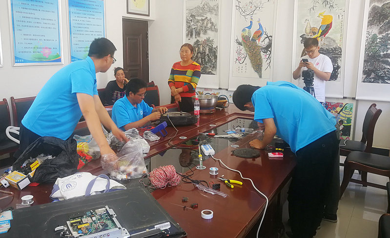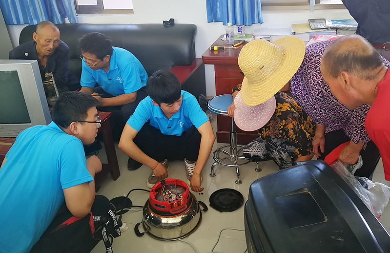 8月24日上午,小分队来到桐川镇党腰岘村。在村委会为村民维修家用电器。村民们从家里送来了电饭锅、热水器,电视机、洗衣机、电冰箱,与小分队师生热情交流。一位老人提来了家里烧坏的3只电热水壶,并说家里烧坏一只就只能买一只新的,没想到小分队到家门口为他们免费维修,这样可以省下不少钱。队员们看到自己的服务为村民带来实惠,也倍感欣慰。中午队员们放弃回驻地休息的安排,维修活动一直持续到下午6点,当天共为党腰岘村村民维修电视机2台,洗衣机2台,电饭锅18个、热水器23个,共计45件家用电器。