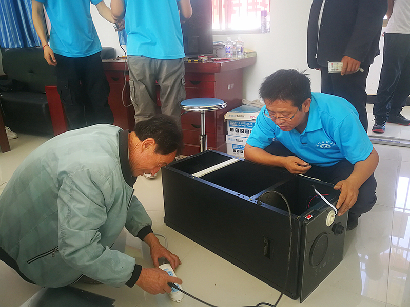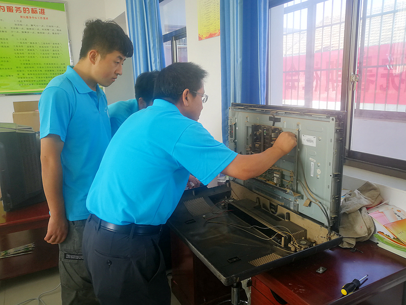 8月24日上午,小分队来到桐川镇高庄村。一进村委会,就看见村民们拉着电视机、冰箱在等候。队员们迅速投入维修工作中。孔繁庭教授还利用工作空隙,带领学生深入村民家中,帮助解决电视信号接收问题。当天共为高庄村维修电视机7台,冰箱3台,电饭锅3个,热水器9个,共计22件家用电器。