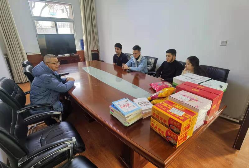 王克太与留学生亲切交谈,仔细询问他们的学习和生活情况,代表学校祝愿留学生在中国过一个平安、祥和、有意义的新年,为同学们送上了节日慰问品并请他们代为转达学校对其家人的新春问候。