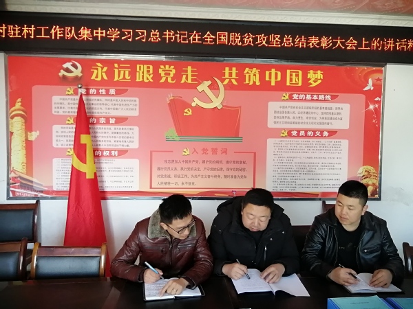 会上,高翔同志领学了习近平总书记在全国脱贫攻坚总结表彰大会上重要讲话精神。全体党员开展了积极讨论,大家一致认为:驻村工作队要根据讲话精神紧紧立足新发展阶段、贯彻新发展理念,坚持把解决好“三农”问题作为驻村工作重中之重,继续发扬决战决胜脱贫攻坚中披荆斩棘、栉风沐雨、钉钉子的精神,敢于啃硬骨头,坚定信心决心,以永不懈怠的精神状态,一往无前的奋斗姿态,真抓实干、埋头苦干、乘势而上、接续奋斗,走中国特色社会主义乡村振兴道路。