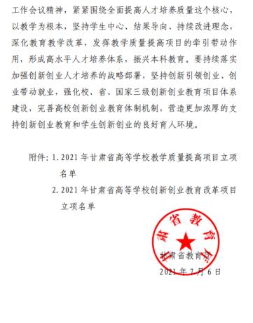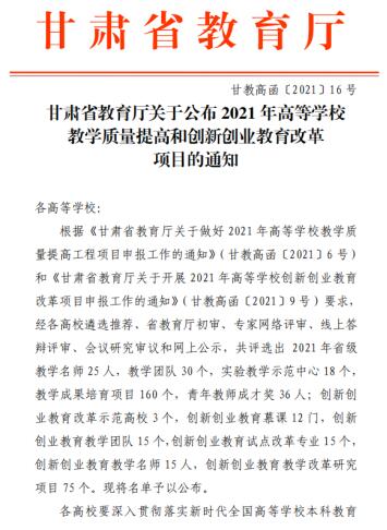 近日,甘肃省教育厅下发了《关于公布 2021年高等学校教学质量提高和创新创业教育改革项目的通知》(甘教高函〔2021〕16号),我校再获佳绩,共19项项目获省级立项,其中,吴晓玲教授获省级教学名师荣誉称号、展惠英教授获省级创新创业教育名师称号、张惠教授获青年教师成才奖荣誉称号,“旅游管理专业教学科研团队 ”“广播电视学专业教学团队 ”获批省级教学团队,“数字媒体与智能信息处理实验教学中心”获批省级实验教学示范中心,“产品开发引领应用型本科内涵转型的实践与探索”等8项项目获批省级教学成果培育项目,《大学生创新创业》课程获批省级创新创业教育慕课,“数字媒体创新创业教学团队”获批省级创新创业教学团队,“基于应用型课程建设的数字媒体类专业创新创业人才培养研究与实践”等3项项目获批省级创新创业教学改革项目。