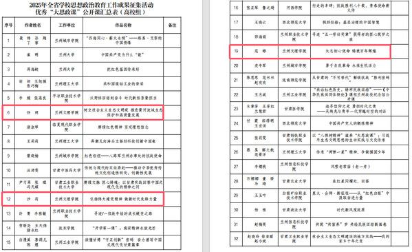 本次成果征集活动旨在深入贯彻习近平总书记关于思政课建设的重要指示精神,推动大中小学思政课一体化建设。经各地各校推荐、专家评审与公示,我校任玥老师主持的《树立社会主义生态文明观推进黄河流域生态保护和高质量发展》、沙莉老师主持的《弘扬伟大建党精神做新时代先锋力量》、范婷老师主持的《矢志初心使命铸就百年辉煌》入选优秀“大思政课”公开课;陈兵建、王晗睿老师《新时代地方非民族高校铸牢中华民族共同体意识教育创新路径研究——以兰州文理学院为例》,董银雪老师的《融媒体时代短视频助力高校校园文化建设研究》,以及张艳、马然老师的《自在·自觉·自为:中华民族共同体的历史演进与时代铸魂使命探赜》获评优秀论文。